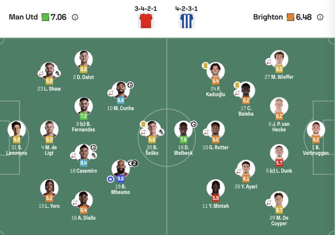 曼联(3421):31-拉门斯;15-约罗,4-德里赫特,23-卢克肖(65‘26-海文);16-迪亚洛(70‘13-多古),18-卡塞米罗(70‘37-梅努),8-B费,2-达洛特;19-姆伯莫,10-库尼亚(81‘25-乌加特);30-谢什科(82‘11-齐尔克泽)